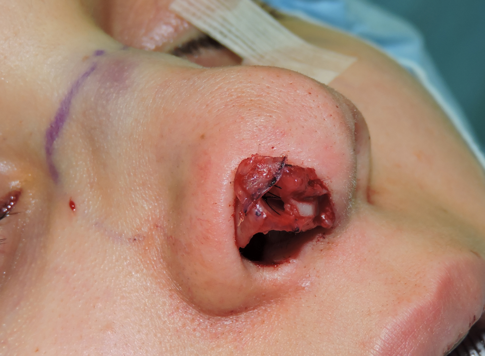 Fig. 10. Intraoperative view of a patient with the tip onlay graft carved from the cephalic trim (29), secured on a stable basis made of medial crura and columellar strut.