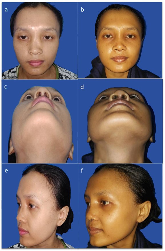 The postoperative result showed straight nasal, browtip aesthetic line, increase nasal tip (Figure 15 b,d,f).