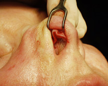 Tip surgery is usually a challenge in rhinoplasty. The surgeon has the choice between open or internal approach [3]. The internal approach has unique internal incisions that do not scar the columella and has a good aesthetic evaluation. The open approach gives a better access to the bony and cartilaginous structure of the nose, but leaves a scar on the columella. This approach separates the nasal skin from the bones and cartilage, and limits the evaluation the dorsum and the projected tip. The section of the lymphatic and venous drainage provokes a lasting oedema of the tip. The internal approach is uncomfortable for the surgeon and the open approach is uncomfortable for the patient. For these reasons, a surgical alternative is proposed. It should enable a wider exposition of the cartilaginous tip without the columellar incision. Guerrerosantos [1] and holmstrom [2] were the first to describe this wide marginal incision technique and publish their results. This technique remains an internal approach as opposed to the open external approach. The wide marginal approach is probably used implicitly by surgeons who extend their internal incisions during the procedure. This approach allows work on the cartilage junctures of the nose and on the dorsal hump if needed (rasp or osteotomies). Lateral osteotomies are done in an ascending motion with curved ostetomes. Tip correction and common procedures on the nasal tip is easy through the wide marginal approach [4]. Tip grafting with several types of grafts is possible, including spreader graft, strut graft, and shield graft. The wide marginal approach is to be considered when difficult nose tip work is planned during surgery. It is an acceptable alternative when facing patients refusing a columellar incision, or in case of difficulties during an internal approach procedure.